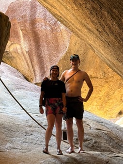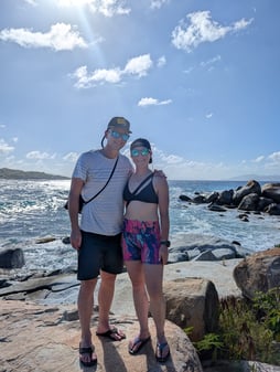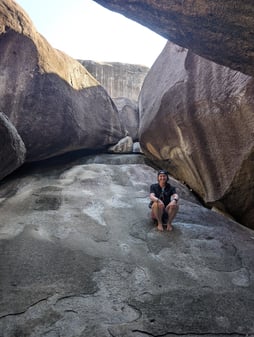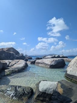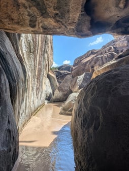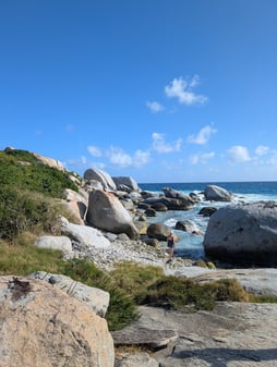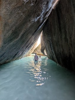 Since we decided to skip Anegada due to choppy conditions, we went to Leverick Bay the next day, which is right next to North Sound. On the way to Leverick, we headed outside of the bay and into the channel in order to uh...open the holding tanks (i.e. get rid of our shit). This process consists of climbing down in the hulls to open a valve for a little bit of time, and then close them before heading back into a bay. I volunteered for this, and unfortunately, due to the choppy conditions, this is the only time on the trip that I felt a little bit of seasickness. So some land time on Virgin Gorda was nice after that. We decided on Leverick Bay so that we could grab a taxi and get down to the Baths. Normally, we would do a day-mooring right outside of the Baths and swim into them, however with the choppy seas, and the fact that we were already on the opposite side of the island, we thought this would be better logistics. Plus it gave us the chance for some amazing land views. The Baths are a bunch of rocks that are on the beach and in the water, and you can climb in and around them, so it is a unique experience. Also, the taxi itself is quite an experience....steep and curvy roads combined with bench seats and no seatbelts....we were living on the edge, haha. Some picture below to show how cool Virgin Gorda is.