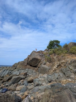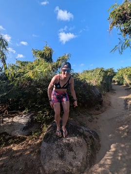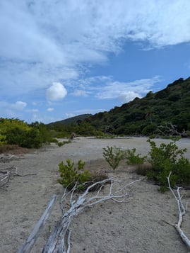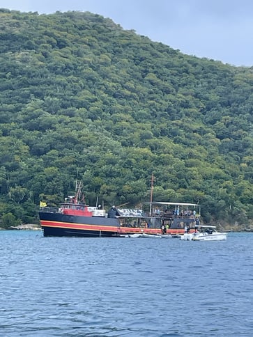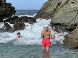 Next we headed to Jost Van Dyke. Had an awesome day of sailing on the way, got another pop up shower, but no issues on the way. Once we got to Diamond Cay, the mooring ball we booked was already taken, but luckily we were able to snag a different one. A little while later, we noticed that the power cat near us didnt seem to be attached to their mooring ball anymore and was drifting back towards the shore....yikes! N8 and jumped on the dinghy to try and see if we could do anything to help, and another couple people were thinking the same as us. We didnt make it before the boat got beached on some sand, but we tried, along with a number of other people. It was probably the best place for something like this to happen, since the bottom was sandy and the current pushed the boat that way (instead of out to sea!). After a bit, the folks on that boat got back to it, had it towed off the sand, they put it back on the mooring ball (with better lines this time), and continued their partying and vacationing. Remember getting the lines on the mooring ball correctly is important! Our land excursion here was to get to the bubbly pool, which is a little pool behind some rocks, so when the ocean waves come in, they get bubbly and frothy and it kind of looks like a jacuzzi with a mean rip tide. The "hike" to get there was not as well marked (or we didn't see the signs), so we did make a couple wrong turns, and there was a few steep/rocky areas. I wish I had my altras, since those are so grippy, but instead had my Oofos flip flops. Great on the way to the bubbly pool, but once my feet got wet, it was slippery city between my foot and the sandal. So my review of Oofos....not so grippy, haha.