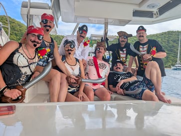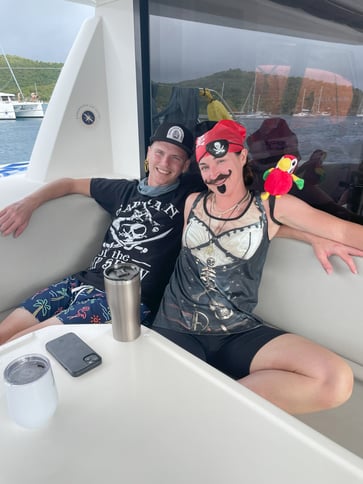 Norman Island is home to Willy T, which is a bar that is on a boat. Pretty fun place - a lot of folks jump off the second story, despite the signs that say no jumping/diving, even though they seem to have a jumping platform there....I didn't jump this time, but have done it before. It is a good time. We went to Willy T in the afternoon, as we decided to have our own pirate party at night. Steve and Cathy were gracious enough to lug all the pirate gear to the BVI. We had some shirts, swords, parrots, and I think about 1 million fake mustaches, which we continued to find all over the boat the following couple of days.