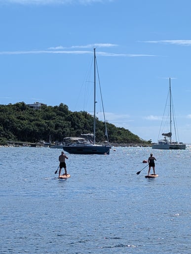 OK, now for probably one of my favorite days of the trip. We got up early and headed to White Bay to visit the Soggy Dollar, which is the original creator of the Painkiller. Yummy. We got there before too many other boats were there, which was good since we are not as confident with our anchoring skills. But we anchored successfully on the first try (had to set the bridle twice, oops). Then we swam into the bar....so our dollars were soggy! But not really, we used a dry bag so our phones didn't get wet, cuz you know we can't live without our phones. Got some painkillers from the bar, walked around the beach, and just enjoyed a really nice morning and afternoon . After the sun and sand, and maybe another painkiller, we sailed over to Soper's Hole for the night. More fun times in the water with the paddleboards and floaties, and a beautiful sunset. There were also some very fancy boats in this marina, so we drooled over those a little bit.